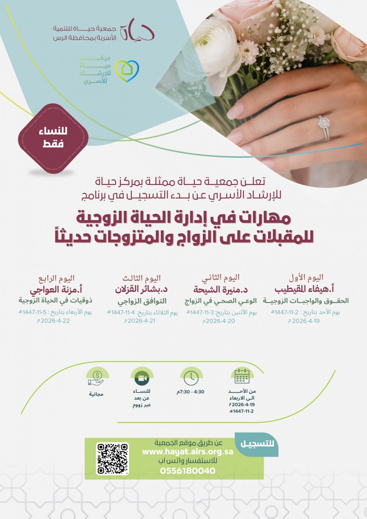 مهارات في ادارة الحياة الزوجية للمقبلات على الزواج والمتزوجات حديثًا شهر 4\2026