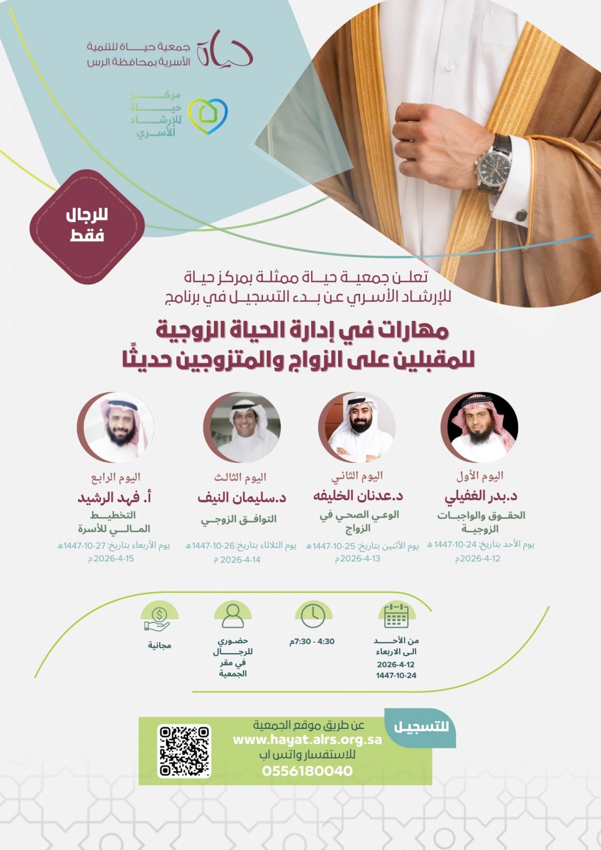 تاريخ اقامتها 10/24 الى 10/27 من العام 1447هـ يقيمها مركز حياة للإرشاد الأسري ممثل بقسم البرامج تبد الساعة 4:30م الى الساعة 7:30م الدورة حضوري في مقر الجمعية **خاصة بالرجال**